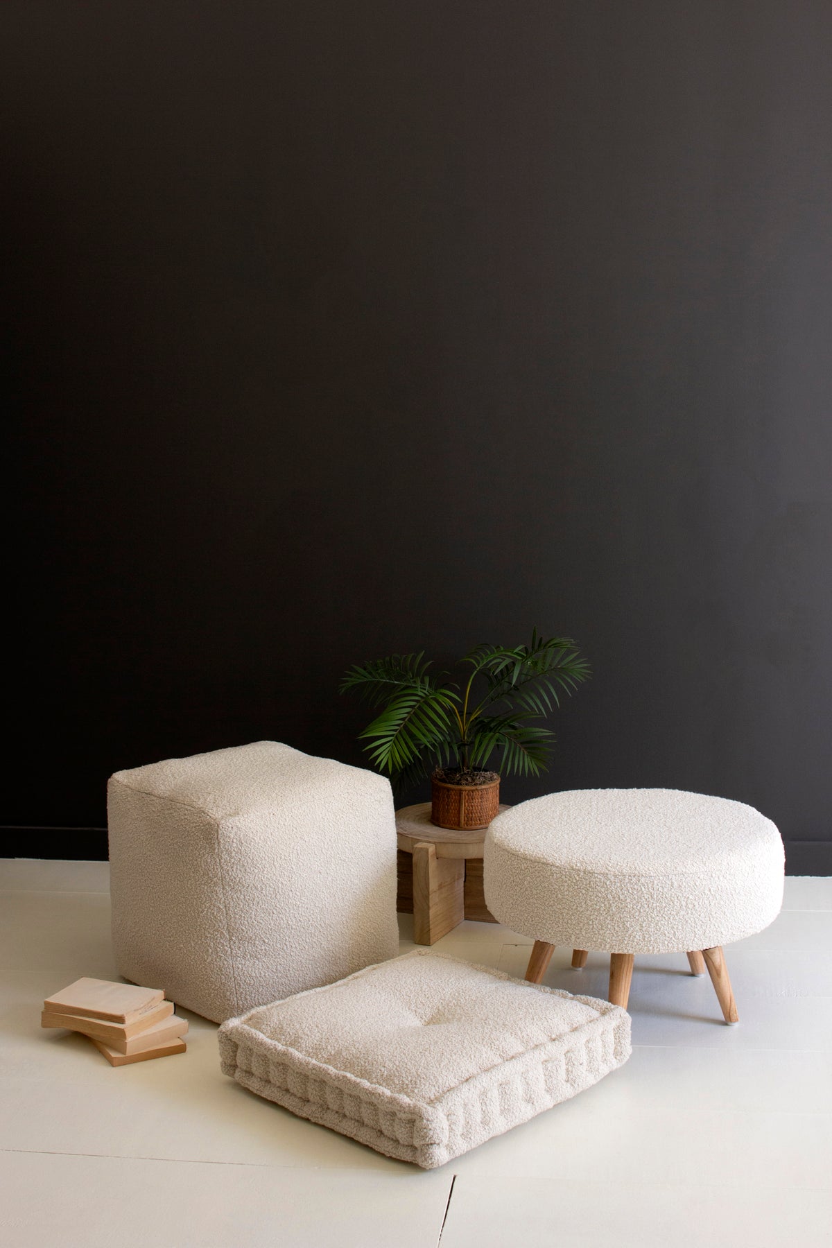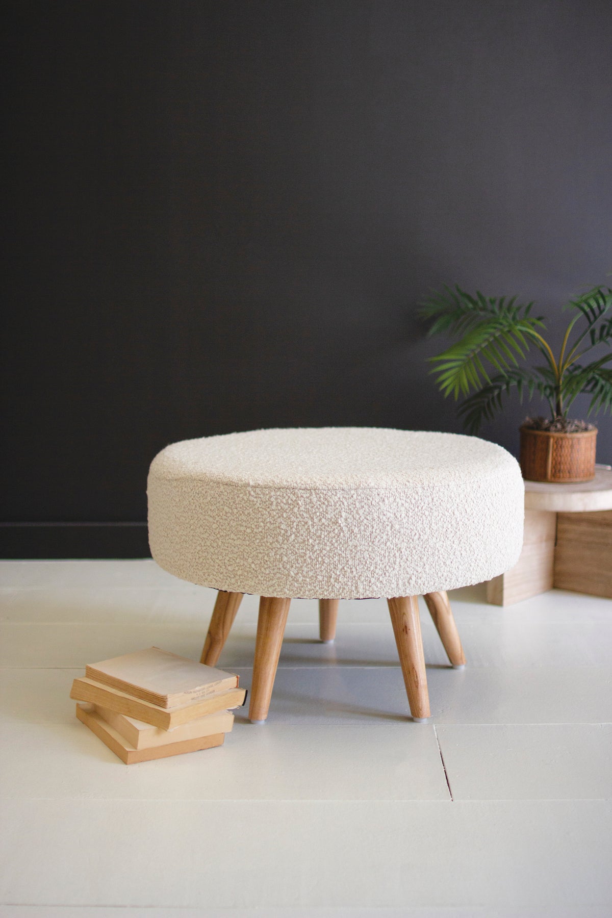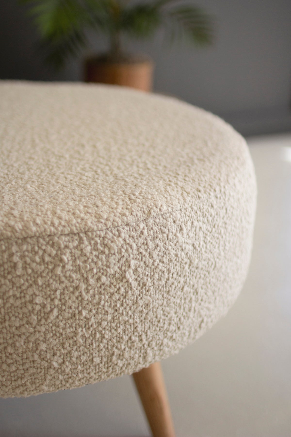 Large Boucle Stool With Wooden Legs - Pearl